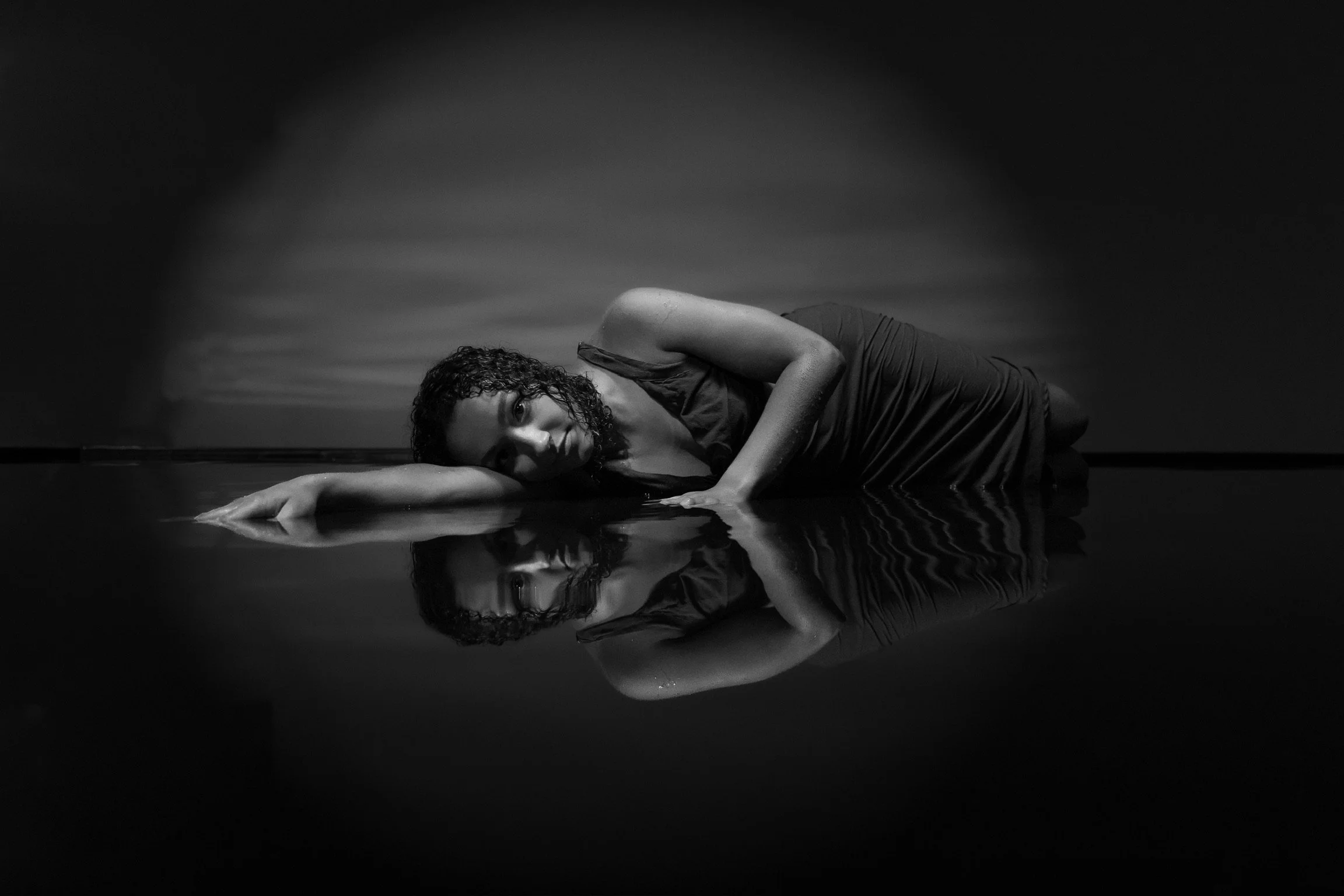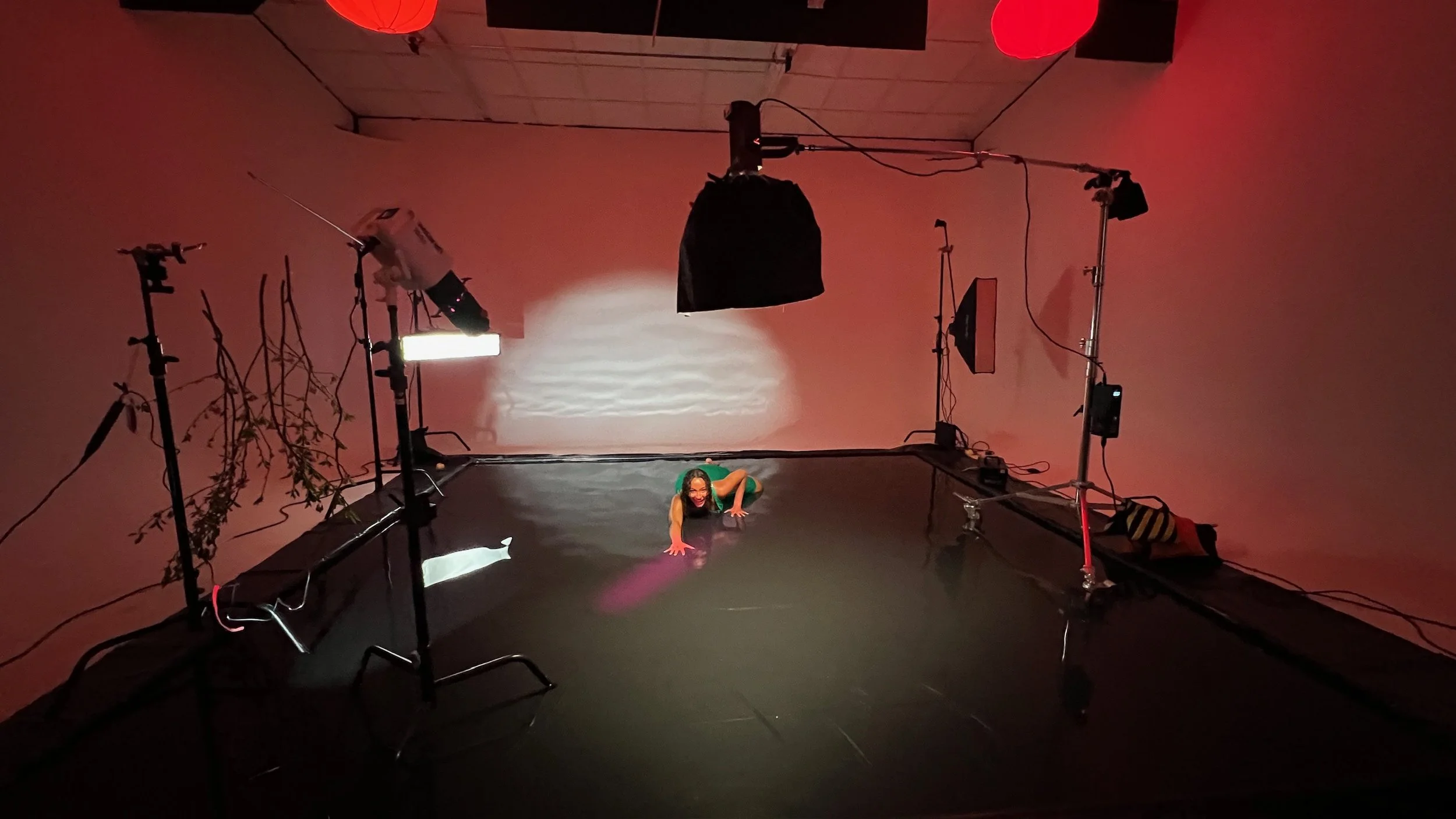 A 14’x14’ “water floor” lined in black on our 3-walled cyc in Studio B. Pre-set lights and rigging that we can help with, and you are welcome to change.